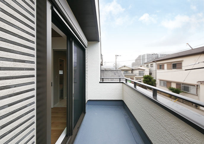 奥行き1,650mmのワイドなバルコニーはテーブルセットも置けるゆとりの広さ。リビングにつながる屋外寛ぎ空間としてもご利用頂けます。もちろん、物干しや、各室へ採光を導くのにも活躍。