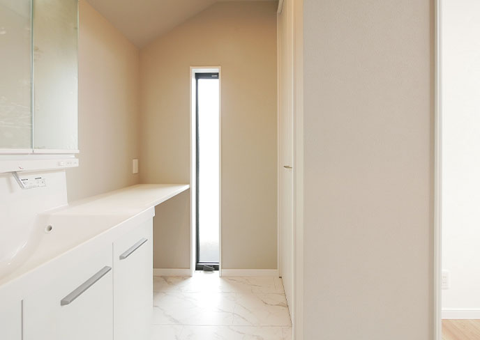 ❷脱衣所とは別に独立した、スリット窓のある明るい洗面室を設け、家族が入浴中も気兼ねなく寝支度を行えます。ドレッサー横にはカウンター、向かいには収納を設けた実用的な洗面を目指しました。
