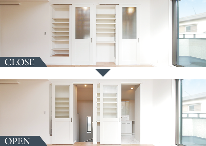 ❸各所の建具を活用した“魅せる”リビング収納。我が家だけの自慢の仕掛けです。