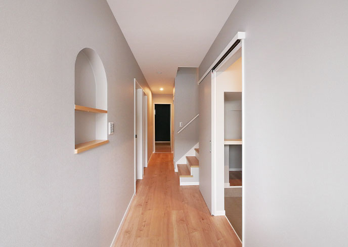 ❻玄関はお客様用と家族用の2WAYエントランス。間口を少し広くした、大きめのニッチのある玄関ホール。