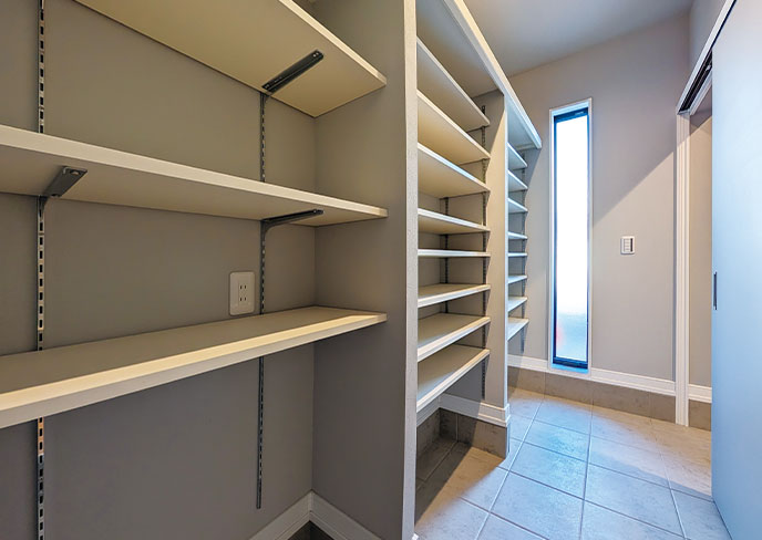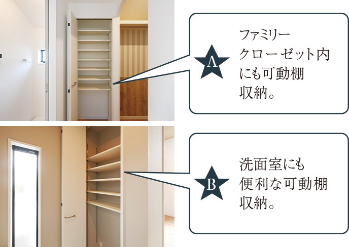 各所の収納は無駄なく収納を活用できる可動棚を採用。ご家族の持ち物に合わせて使える最適収納。