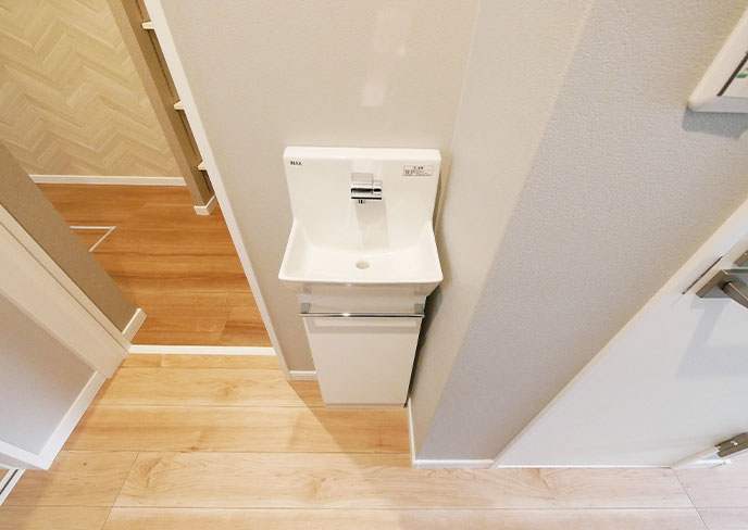 ❽1階トイレ横には“ただいま洗面”を兼ねた手洗い器を設置。居室の並ぶ1階共有部にある水栓は何かと便利。