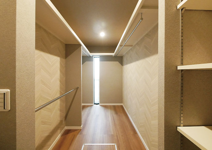 ❺脱衣所とつながる便利なファミリークローゼット。家族の常用衣類はまとめてこちらに収納。