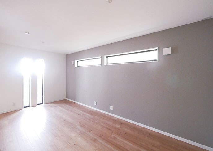 1階の居室にはプライバシー性を重視したスリット窓を採用。家具の配置も邪魔しないおしゃれな採光。
