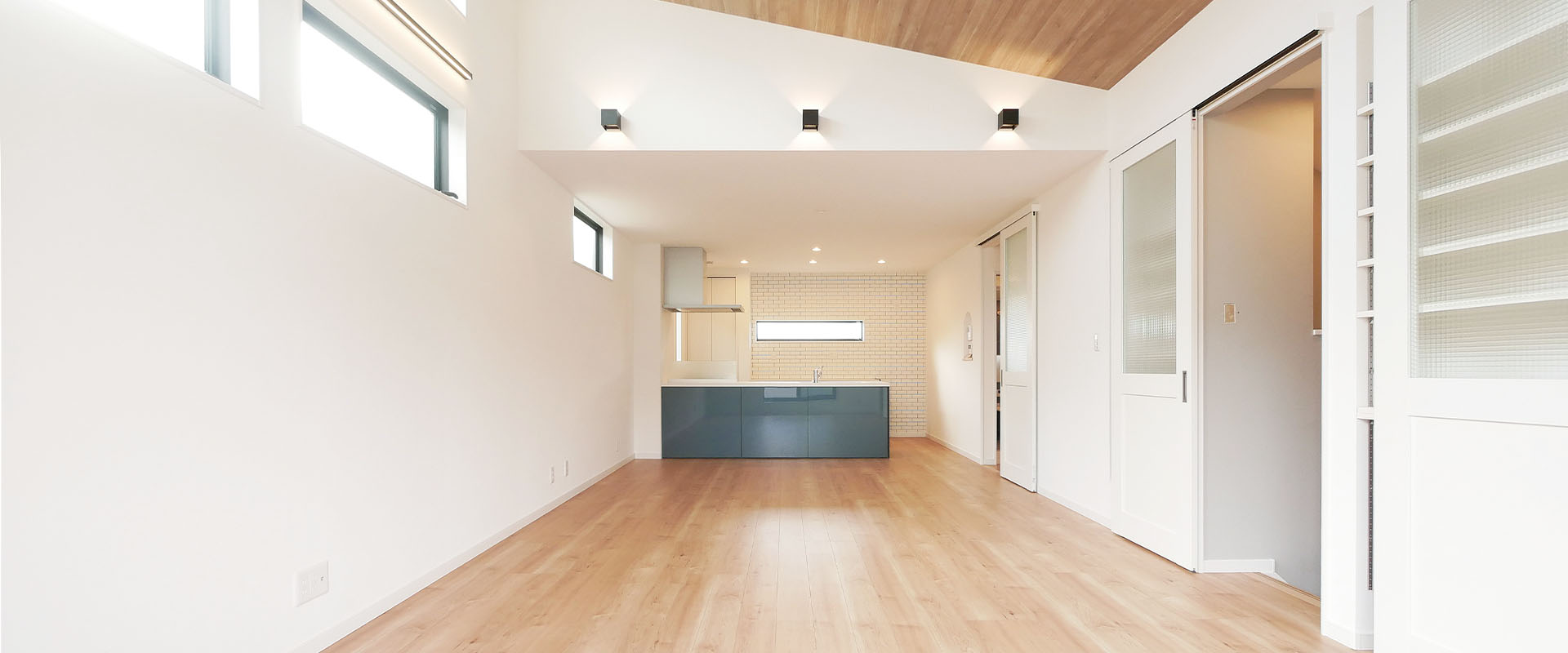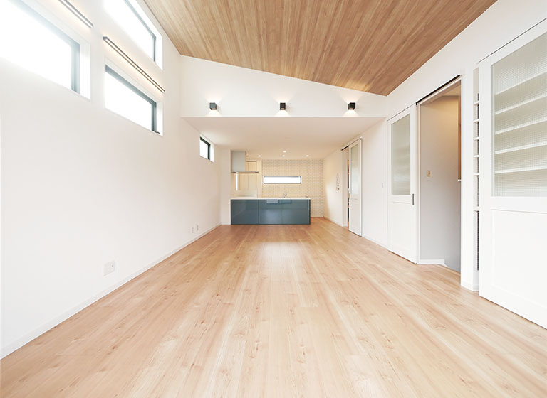 バルコニーからの採光にも恵まれたリビングは、解放感のある勾配天井。床・天井の木目が、建具・壁紙のあたたかみのある白と相まって、一体感のあるLDKの中でもリビングだけの特別感を演出します。