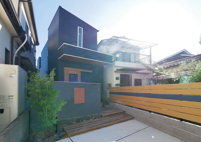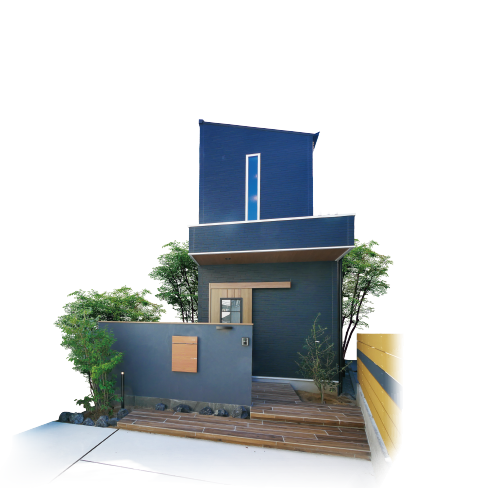 大きめな庇とこだわりのエクステリアで、正面の建物間口が2,700mmであることを感じさせない貫禄の外観。シンプルなダークブルーの外壁に、庇裏や玄関ドア等ポイントの木目を引き立てます。