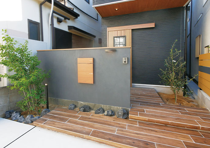 こだわりのエントランス前エクステリア。室内を隠すよう設けた大きめインターホンウォールの裏側には水栓も完備。2本のシンボルツリーの緑と、塗りのグレー壁、木目調の床材がモダンな空間を演出。