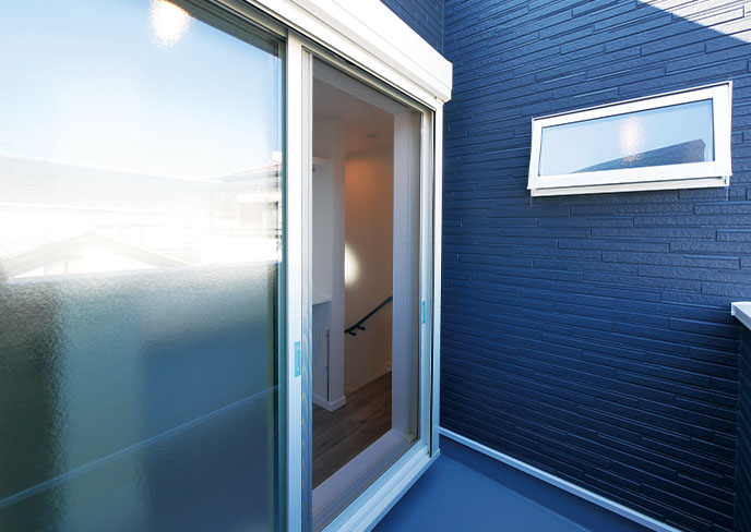 道路側ではない、2階上がり段部分に廊下から出入りできるバルコニーを設置。バルコニーを囲うように廊下が走っているので、そのスペースも含め、物干しとして有意義にご活用頂けます。