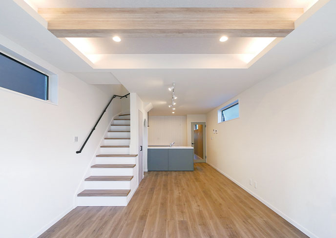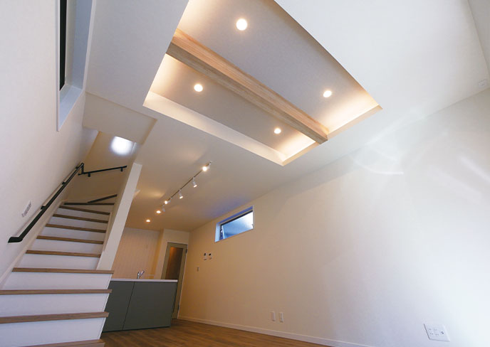 ❶カウンターで隔てないフラットなキッチンから開放的で一体感のあるLDKがひろがります。リビング階段は下段を開放し、圧迫感を軽減。隣家に面する壁の窓は上部のみに設けました。
