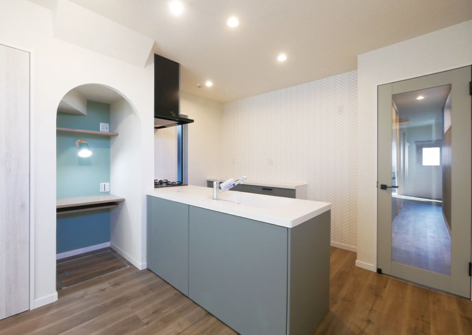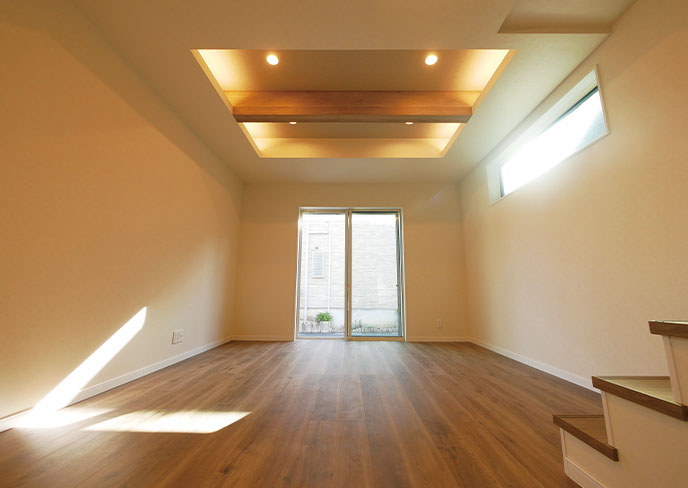 リビング部分には折り上げ天井と化粧貼りで上質な空間を演出。癒しの木目とあたたかみのある白の壁紙が、掃き出し窓からの採光に照らされ、家族の集う場所に寛ぎの時間が流れます。