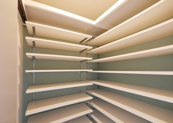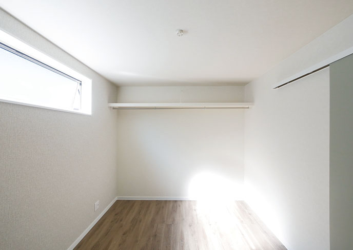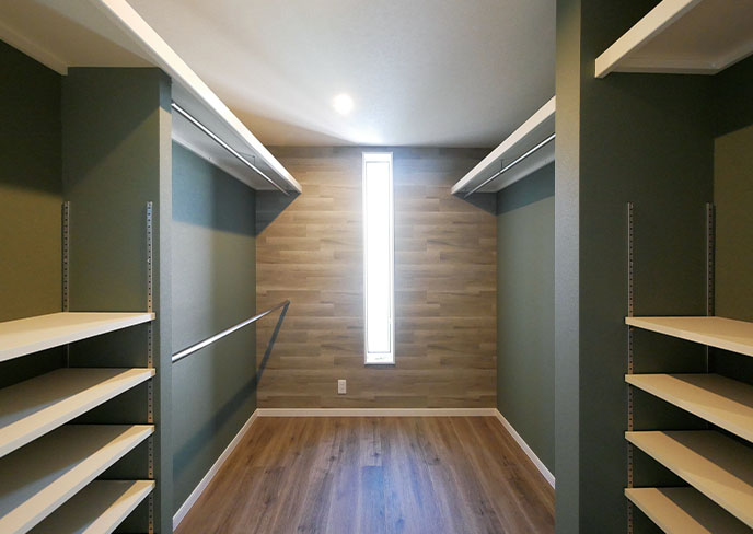 ❷恵まれた敷地の奥行きを活かしドレスルームを設けました。大容量の衣類の収納はもちろん、季節の家電なども収納可能。スリット窓を1つ設け、紫外線や湿度等、衣類の保管に適した環境を目指しました。