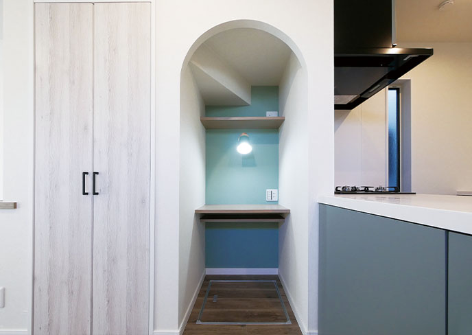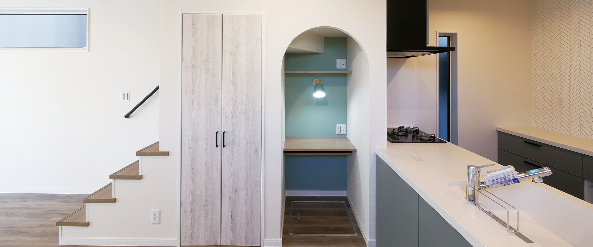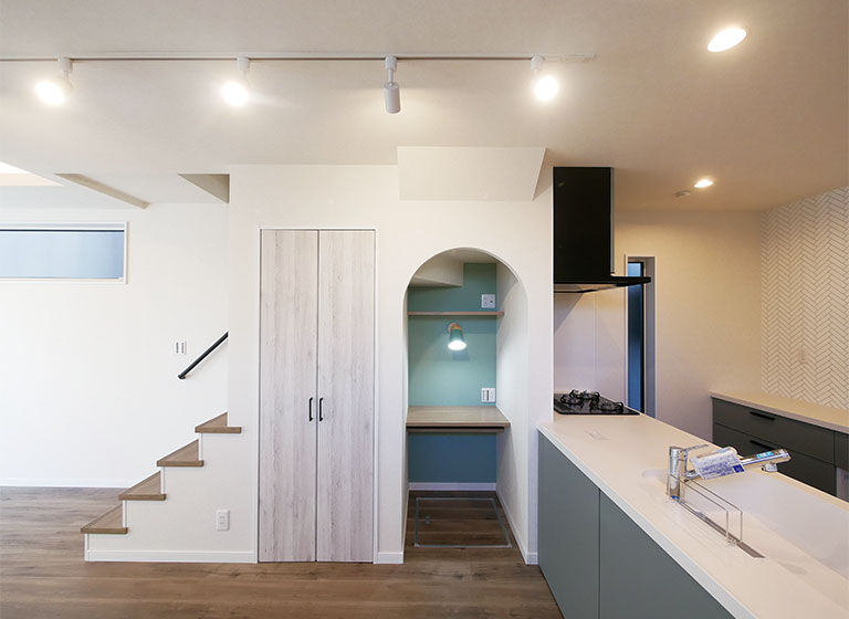階段下スペースを活用して収納と、照明・電源・棚を備えた“籠れる”スタディカウンターを設置。