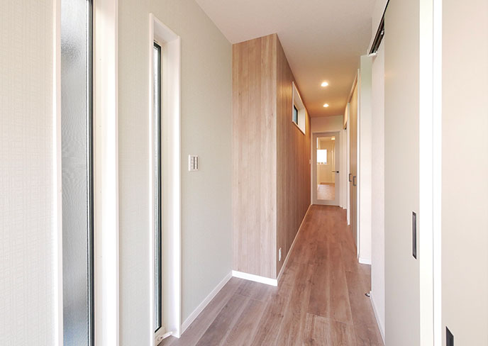 ❼リビングに向けての廊下にもワイドな収納を確保。場所をとるアウターや防寒具を玄関近くに収納。
