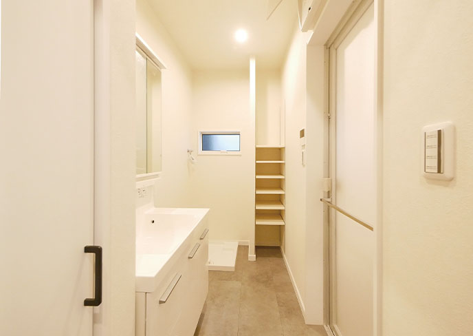 ❽ゆったり広めの洗面室には2ヶ所の収納を完備。タオルや洗剤など使う場所の近くですっきり収納。