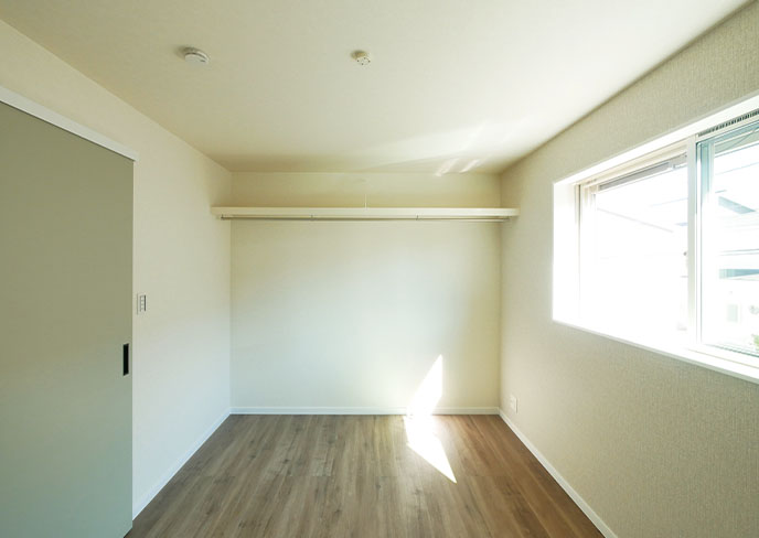 ❾南側道路に面した居室には大き目の窓をとり、1間半のワイドなオープンクローゼットを設けました。