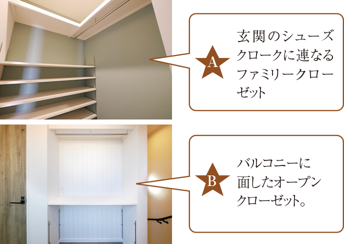 ⓫バルコニーの向かいにはオープンクローゼットを設置。物干しとしても使える便利な仕掛け。