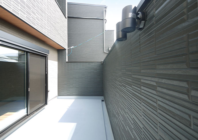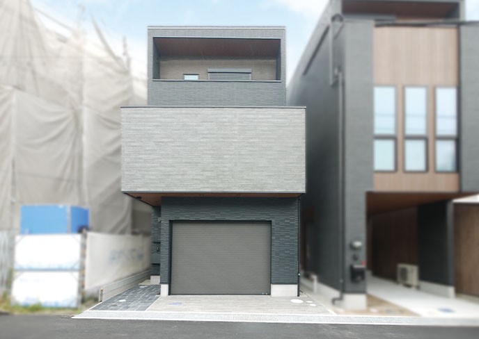 グレー系の濃淡でまとめられた外観は、タイルテクスチャーを採用し重厚感を演出。チラッと見える軒裏の木目調の柄が良いアクセントに。フロントエクステリアは全てタイル仕上げ。アプローチ部分は貼り分けることで視覚的にも洗練された雰囲気に。