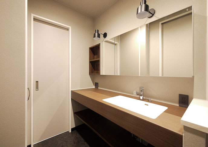 ❷脱衣スペースを兼ねない独立した洗面には大人2人がゆったり並べるワイドなオリジナル洗面台を設置。家族が入浴中でも気兼ねなく使え、寝支度動線がスムーズに。もちろんリネン庫も完備。