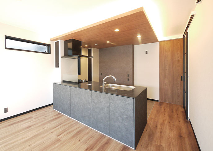 ❸キッチンは折り下げ天井&間接照明を採用。フラットカウンターはダイニング側に収納を完備。