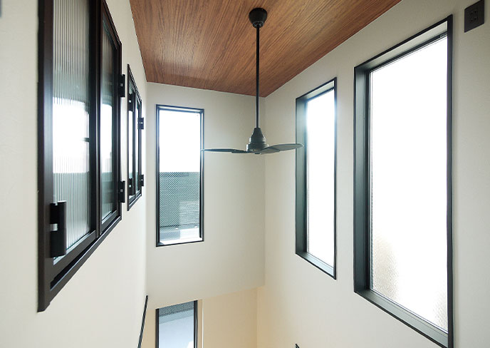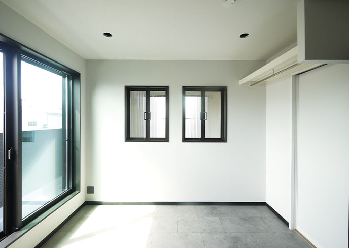 ❽3階南側の居室には吹抜けに面して室内窓を設置。収納は使い易く開放的なオープンクローゼットを採用。