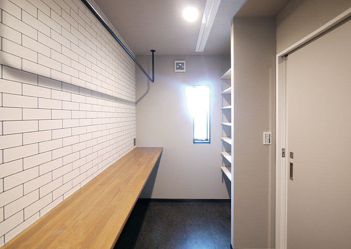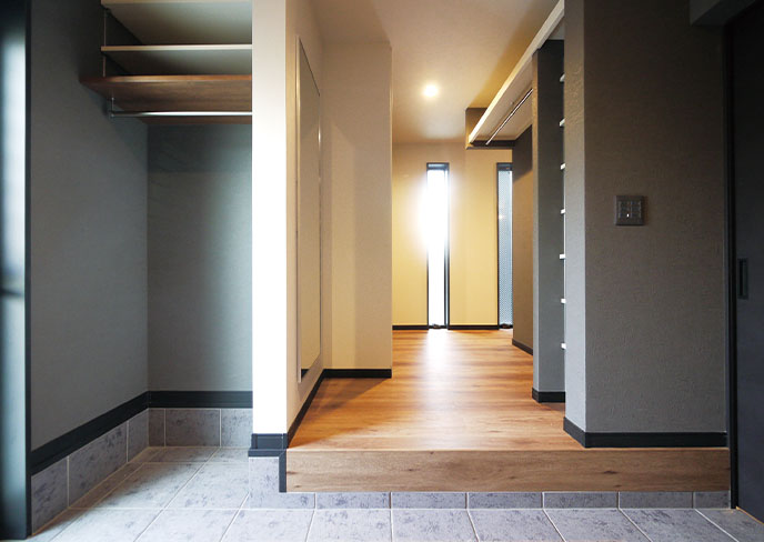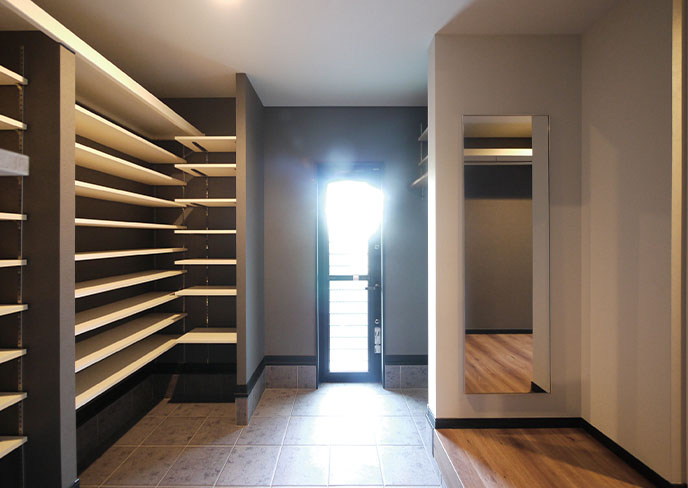玄関には室内側にも収納を完備。アウターや帽子はこちらに収納。出かける前は姿見で全身をチェック。