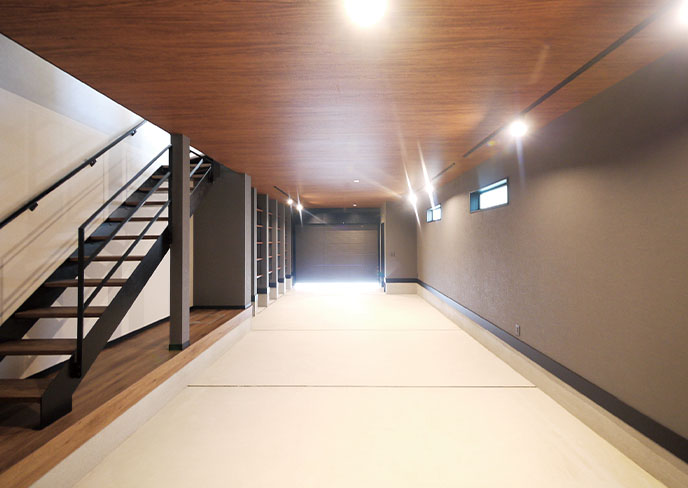 ❿ガレージシャッターの奥には木目調の天井とダウンライトの壮観なガレージ、サイドにはスケルトン階段が広がります。