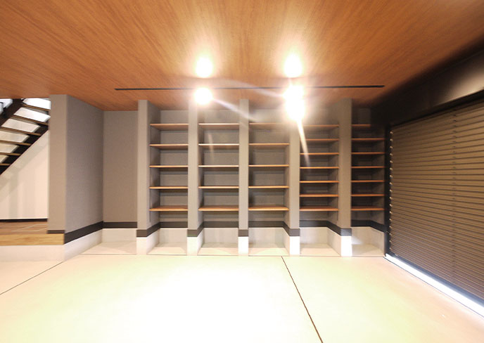強度確保に必要な壁は全て収納として活用し、床に物を置かないガレージを実現。収納前にはスポットライトを設置。