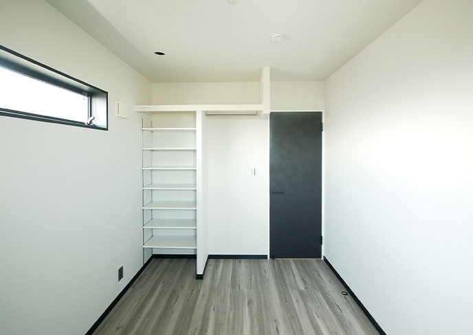 ⓫3階の北側2室も“省収納”。使い勝手を考慮して、こちらの居室はハンガーパイプだけでなく可動棚を設置。
