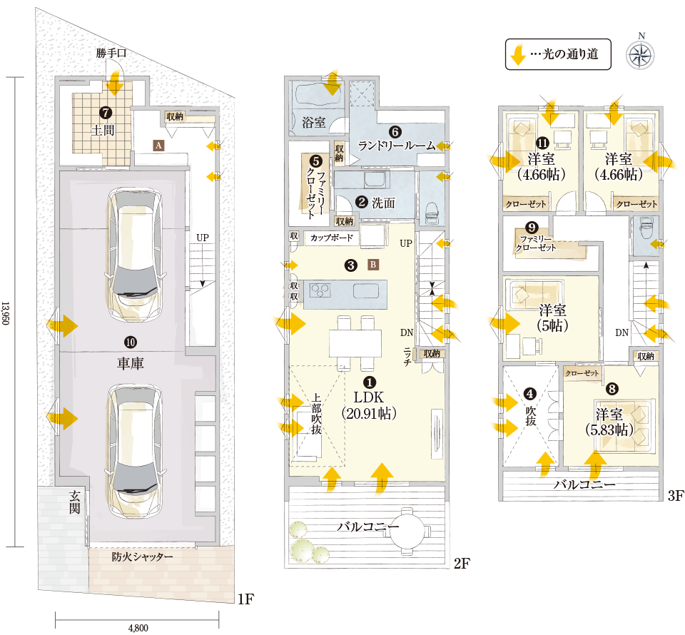 3階にも南向きバルコニーを設置。3階居室はもちろん、吹抜けを通ってLDKを照らします。3階中央にある、暗くなりがちな5帖居室にも吹抜けを通して彩光を確保。南側採光を存分に活用します。