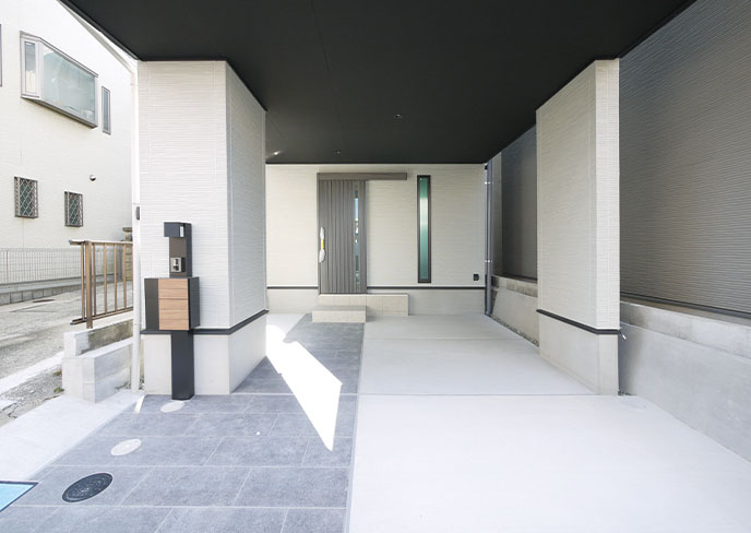 ビルトインガレージは車に加えて自転車等も駐輪できるゆとりの広さ。ラインの入った白い土間にグレータイルでアプローチを描きました。シンプルながらインターホンポールが活きるエクステリア。
