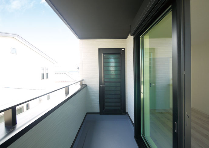 干したものをそのまま取り込める、ファミリークローゼットにつながるインナーバルコニー。屋根のあるバルコニーは急な雨に対する安心感はもちろん、外観的も美しい間口のラインを描きます。