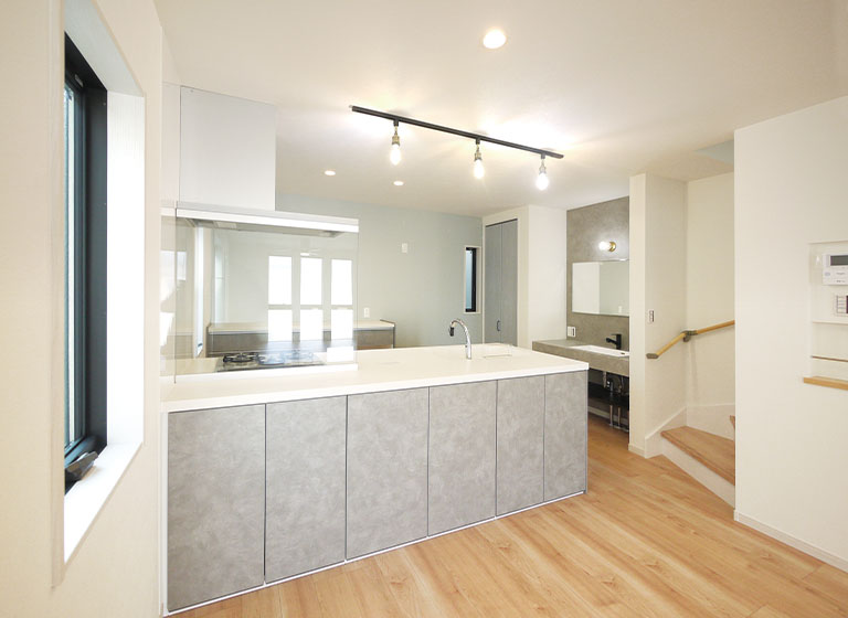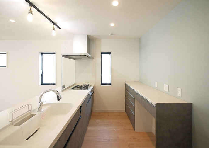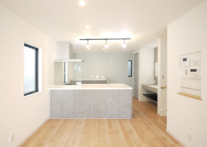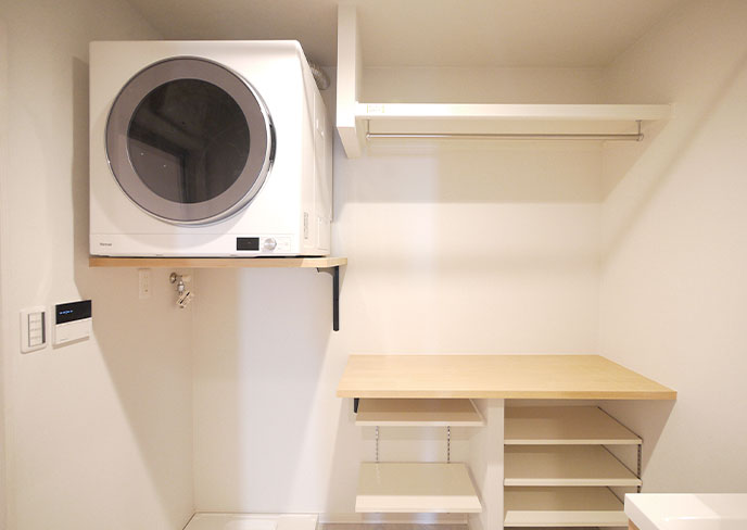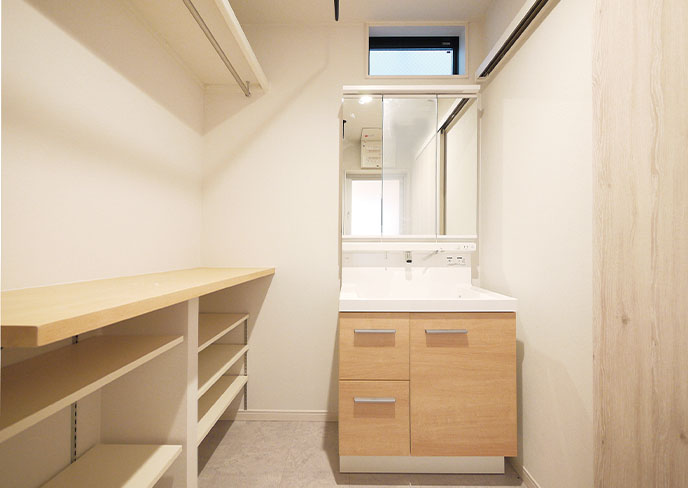 キッチン横の洗面ドレッサーや、リビングの壁裏収納で描く