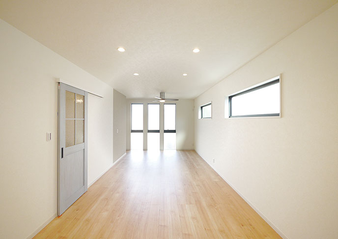 ❷6連窓から導かれる採光に照らされるリビング。贅沢に窓を設けられるのは2階リビングの特権。家具配置も考慮して壁裏収納を設けたので、道路側の一面を採光窓にすることができました。