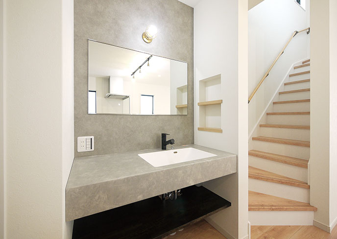 ❸LDKにある洗面なので、デザイン性も考慮した大人2人がゆったり並べるワイドなオリジナルドレッサー。リビング側からは見えない側面に収納ニッチを設置。使い勝手と見栄えを両立します。