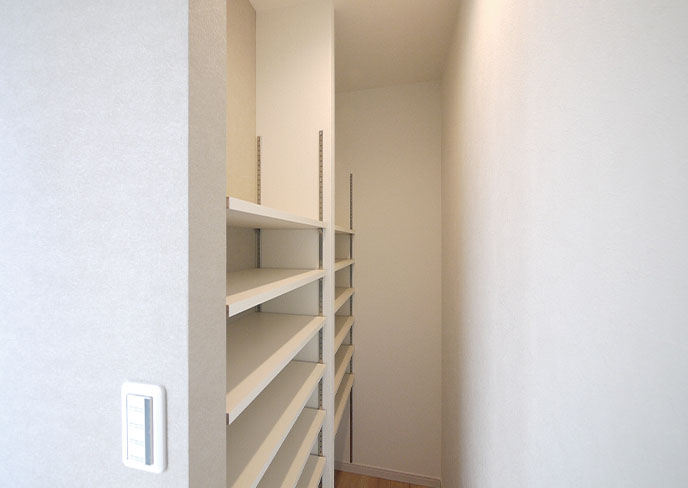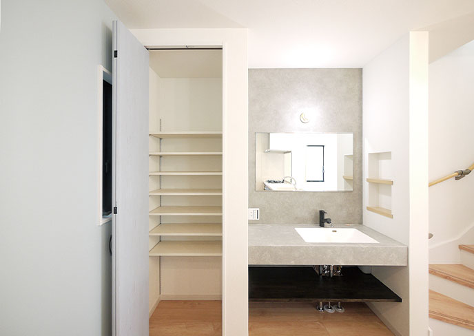 洗面横にはパントリーを兼ねた収納を完備。食材ストックやタオル等はもちろんキッチン家電も収納可能。