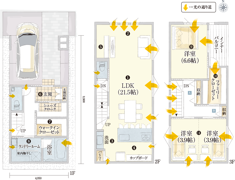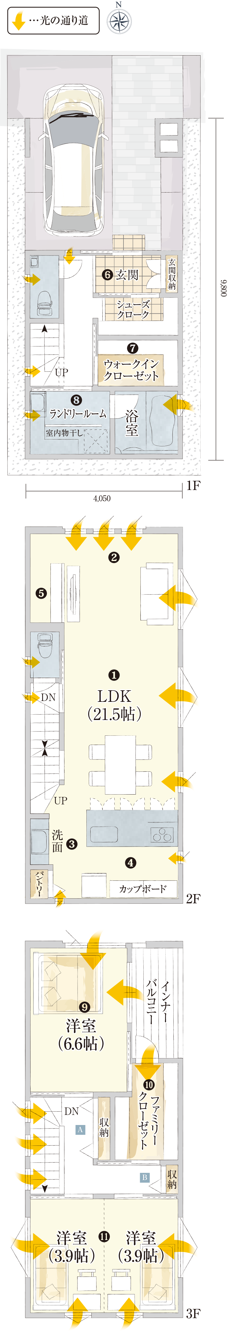 ❶お風呂場近くとは別に、家族の集うLDKに見せられる洗面を設けることで日々の生活動線がスムーズに。家族が入浴中でも、別階で気兼ねなく寝支度が行え、朝の準備も階を跨がず行えます。