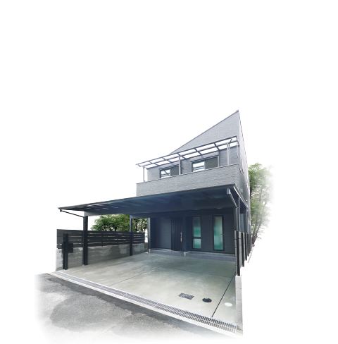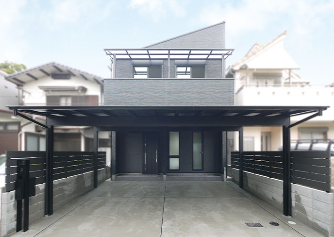 存在感のある大きな片流れ屋根の外観は、シンプルなグレーのタイルに端正なスクエア窓が連なります。広々としたカースペースをすっぽり覆うカーポートを備え、雨の日の乗り降りも安心です。