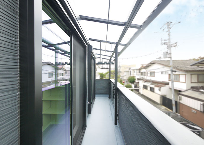 南側には建物間口いっぱいに広がるバルコニーを設置。ランドリールームからすぐの位置で、大家族の洗濯物も気持ちよく乾かせます。急な雨に備え、採光を遮らないクリアタイプのルーフも採用しました。