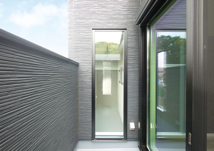 北側にも景色を望みながらくつろげる、奥行きのあるリラックスバルコニーを設けました。やや高めに立ち上げた手すり壁でプライバシーを確保。吹抜けを通してリビングへやわらかな光を届けます。