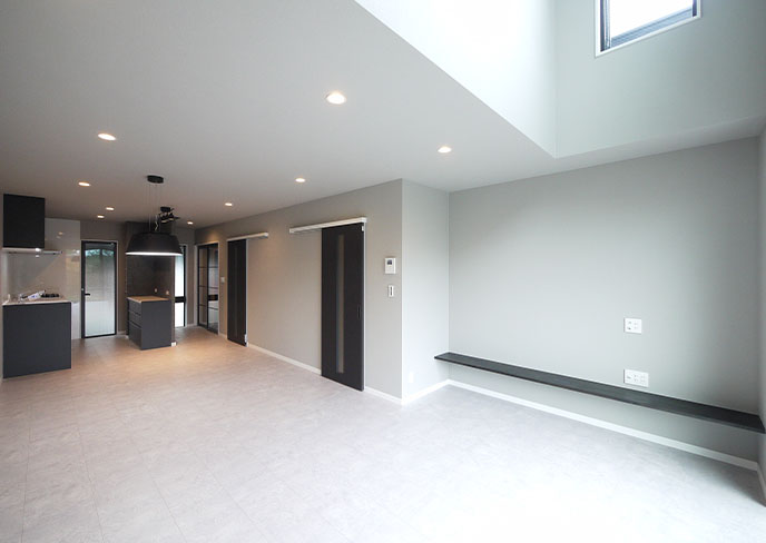 ❶LDKは約20帖のゆとりある空間。リビングには開放感あふれる吹抜けを設け、北側の景色を眺めながら心地よく過ごせます。キッチン奥には駐車場へつながる勝手口があり、買い物後の動線もスムーズです。