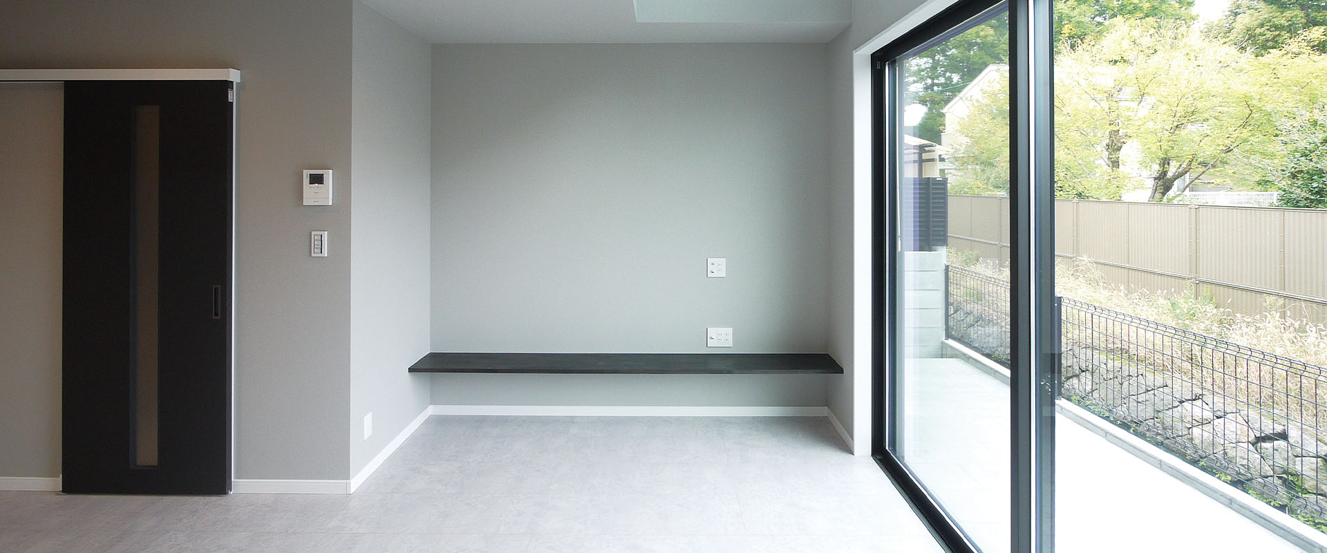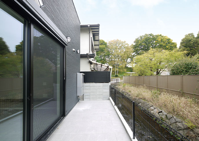 ❷白タイルで化粧された我が家自慢のガーデンテラス。リビングとつながるこの場所は屋外リビングとして、目の前にひろがる美しい景色を楽しみながら、家族で極上の時間をお愉しみ頂けます。