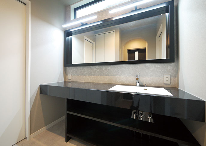 ❸独立した洗面室には、大人2人がゆったり並べるワイドなオリジナルドレッサーを設置。入浴中の家族に気兼ねなく使え、朝夕の混雑も軽減します。専用のリネン収納も確保しました。
