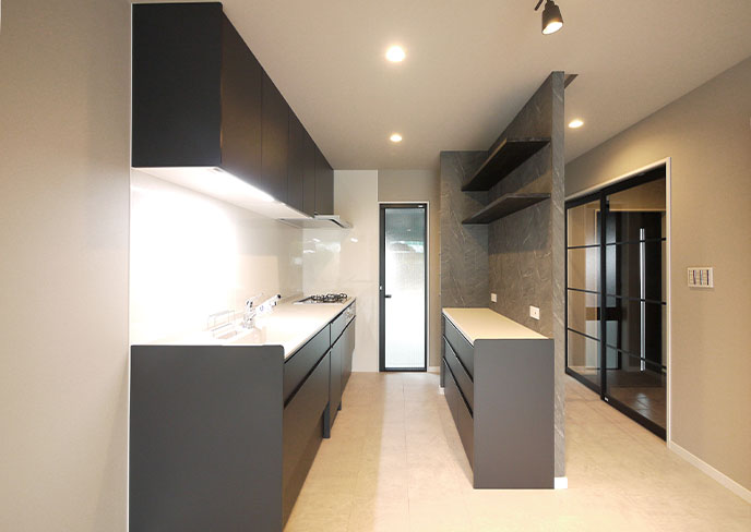 ❹玄関からすぐにキッチンが見えないように壁を立ち上げ、目隠しと収納確保の両役を担います。