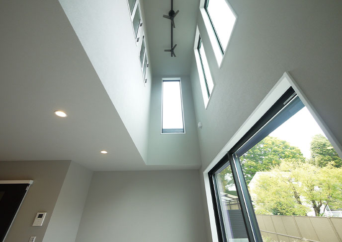 ❺リビングの吹抜けは多彩な窓から自然光を取り込み、シーリングファンを設けることで室内の空気循環にも配慮。