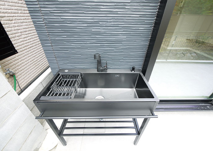 ❻ガーデンテラスにはシンクも完備。BBQを楽しんだり、屋外用品を洗ったりと機能的に活用いただけます。