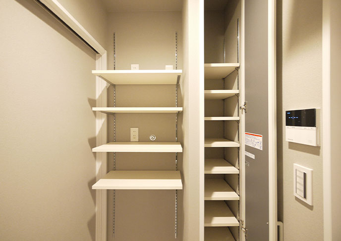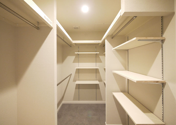 ⓮ワイドバルコニーに面した南側には同プランの2部屋が並びます。使いやすいオープン収納を完備。