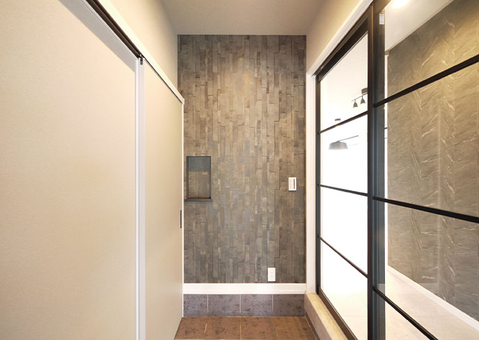 ❽ウェルカムニッチのある玄関は、右に行けばLDK、左に行くとシューズクローゼットへつながる2WAYエントランス。