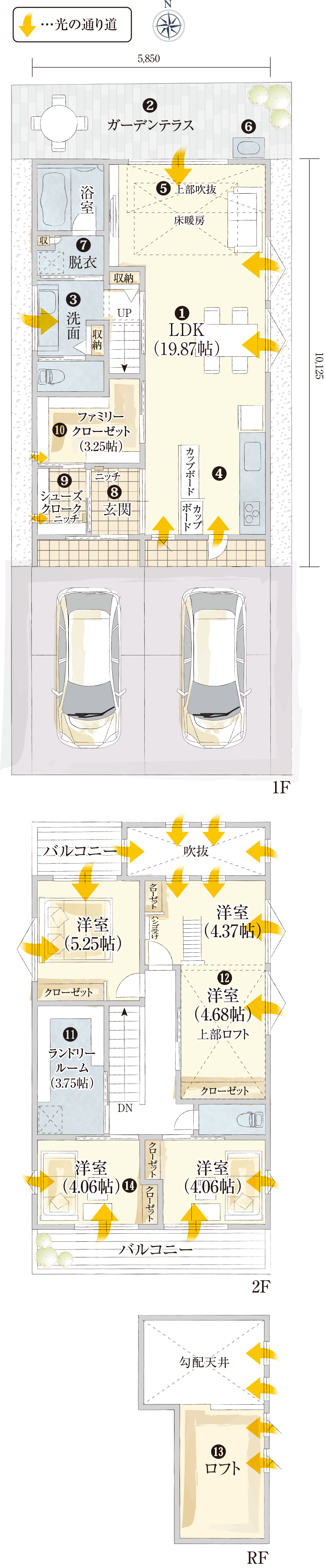 ❿シューズクローゼット・ファミリークローゼットのルートで、帰宅後すぐにルームウェアに着替え完了。