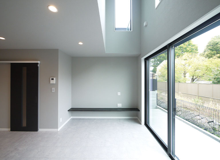 吹抜けのある開放的なリビングとガーデンテラスがある住まい。