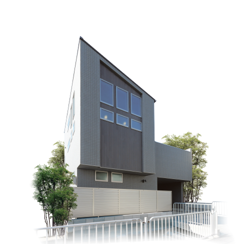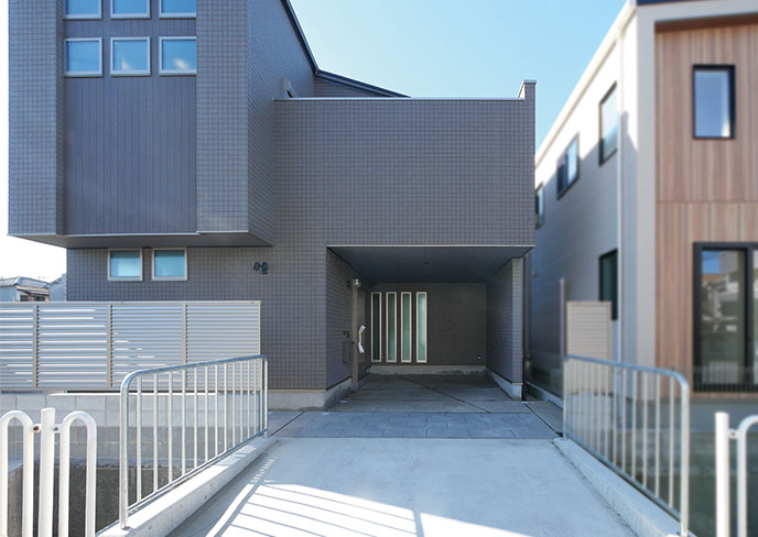 グレーを基調としたシックな外観は正面に並ぶ三連のスクエア窓をアクセント外壁で彩り、印象的な佇まいに。玄関周りをすっぽりと覆うビルトインガレージは雨の日も濡れずに傘を差すことができ、日々の暮らしにゆとりをもたらします。